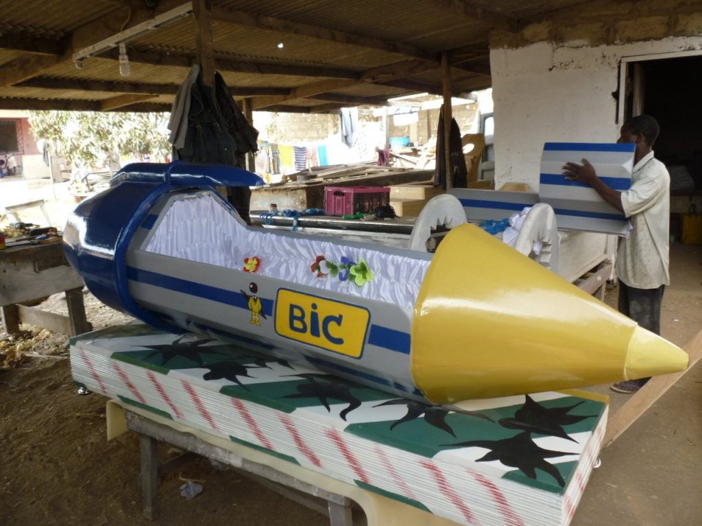 Anang Kwei et sa famille perpétuent une tradition ghanéenne : celle de sculpter des cercueils reflétant la vie ou les rêves du défunt. Bien loin du caractère morbide des rituels occidentaux, il est en effet de bon ton d’enterrer ses proches dans un cercueil personnalisé, reflétant la vie ou les aspirations du défunt. Une personne ayant toujours rêvé de prendre un jour l’avion pourra ainsi être transportée vers sa nouvelle vie dans un avion de bois. Un photographe professionnel ou amateur partira dans un appareil photo de bois. Quelques artisans ont fait de cette tradition leur métier. Anang Kwei et sa famille en font partie. D’un poisson géant à une caméra en passant par une guitare ou une maison, ils sculptent des cercueils qui sont vendus au-delà même du Ghana.